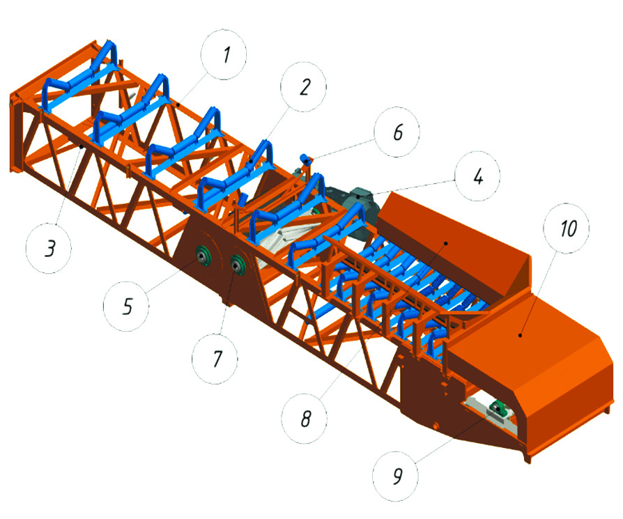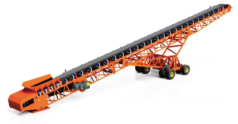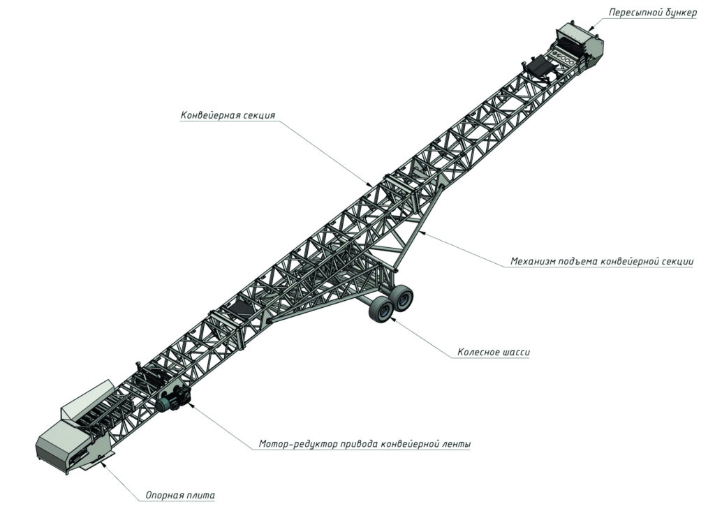 Jump Conveyor («grasshopper») is an inclined transfer conveyor featuring a trussed frame, wheel-mounted chassis, conveyor module, feed and transfer hoppers, and optional accessories such as conveyor belt covers, telescopic loading chutes, and hydraulic boom lift systems. Each unit is equipped with an automated control package and sensor suite for real-time monitoring of process parameters.